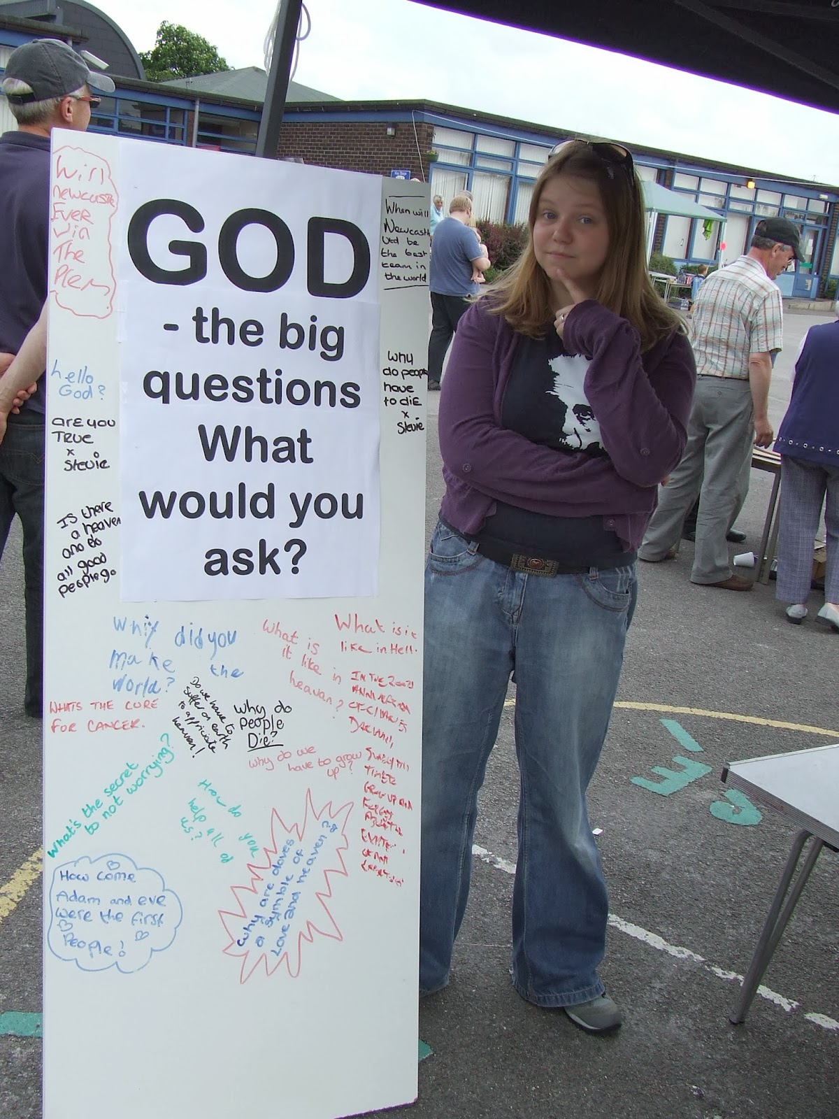 While John manned the Zephaniah stand at the Yorkshire Baptist Association assembly, Julie and volunteer Helen went to Riddlesden, near Keighley, working with Riddlesden Churches Together to run their stand at the annual gala. Helped by Rev Alf Waite and a team of volunteers, they offered free craft activities to children and families. Passers-by were also invited to think about what they would ask God if they could ask him anything and write their questions on the Big Question board. The responses ranged from silly to sublime and meaningful contact was made with more than fifty local families/residents.